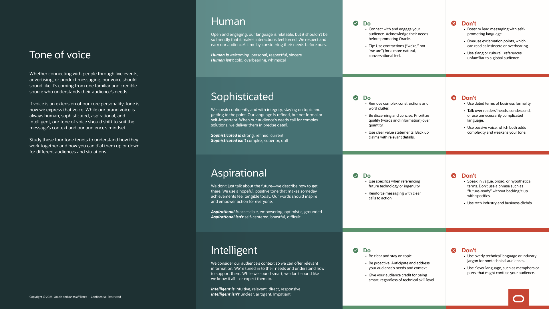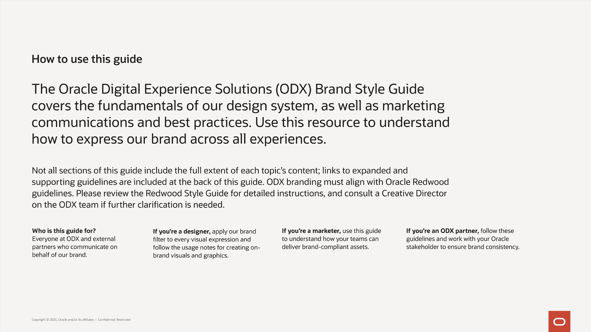 This approach powered a wide range of content including pitch and presentation decks, bi-monthly eNewsletters, strategic planning guides, and LinkedIn thought leadership. The work culminated in the ODX Brand Style Guide, a foundational resource aligned with Oracle’s Redwood standards that empowers teams to deliver high-quality, on-brand work at scale.